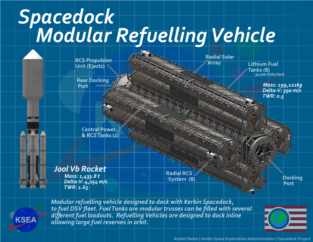KSEA unveils designs for the third component of Kerbin Spaceport: A modular refueling vehicle! Construction has already begun, and will launch soon along with the other components for Kerbin Spacedock!