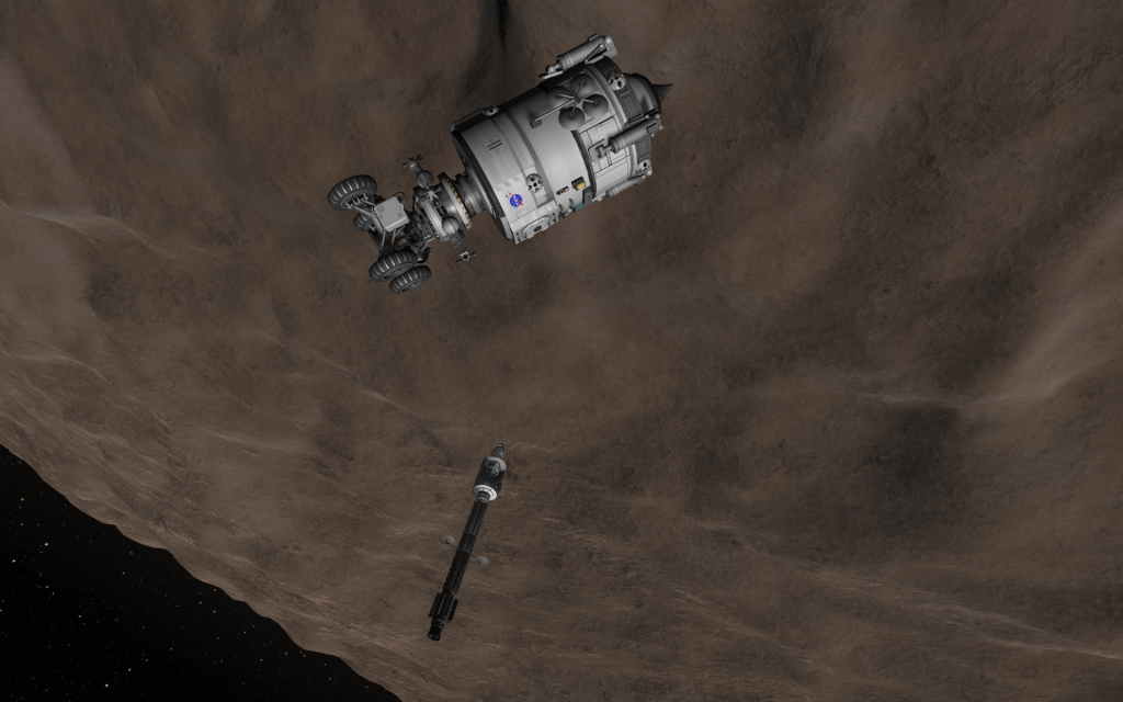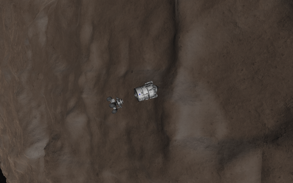 The lander detaches from the rover, and slowly moves in closer and closer to Endeavor’s cargo bay! The primary communications dish is retracted to avoid any incidents!