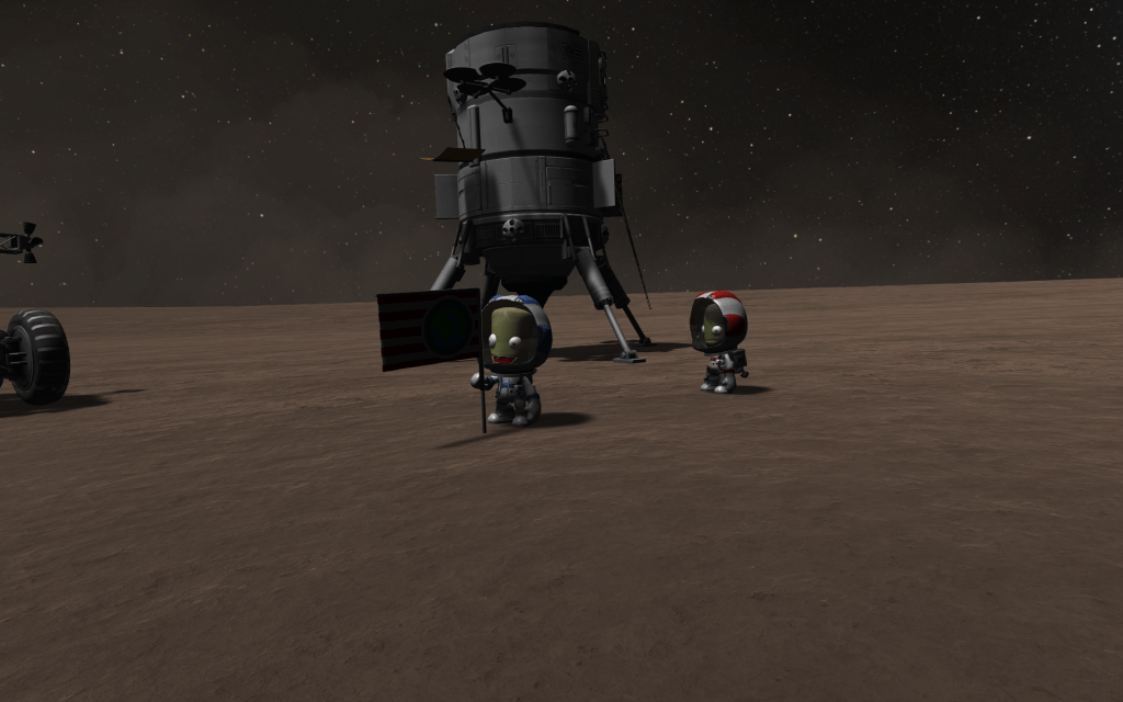 Samner pulls out a Kerbal States flag, and plants it in the ground!