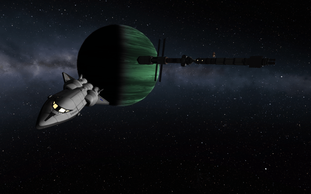 Jeb, Bill, and Bob head over to Spacedock to rest before returning to Kerbin with the mountains of data gathered from Jool’s moon Laythe! There is already talk of building a colony there!
