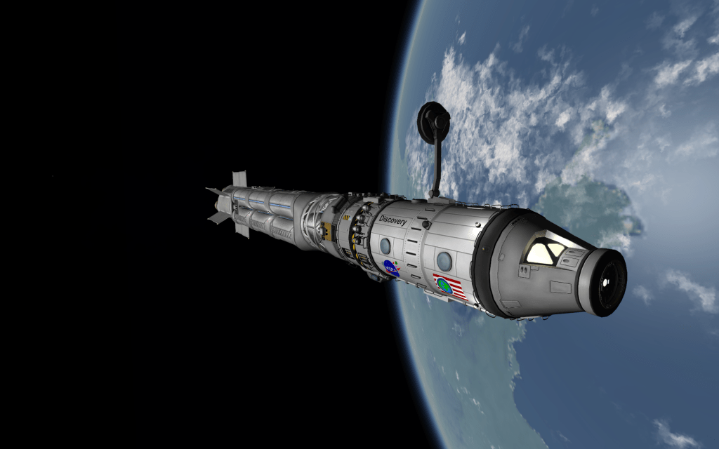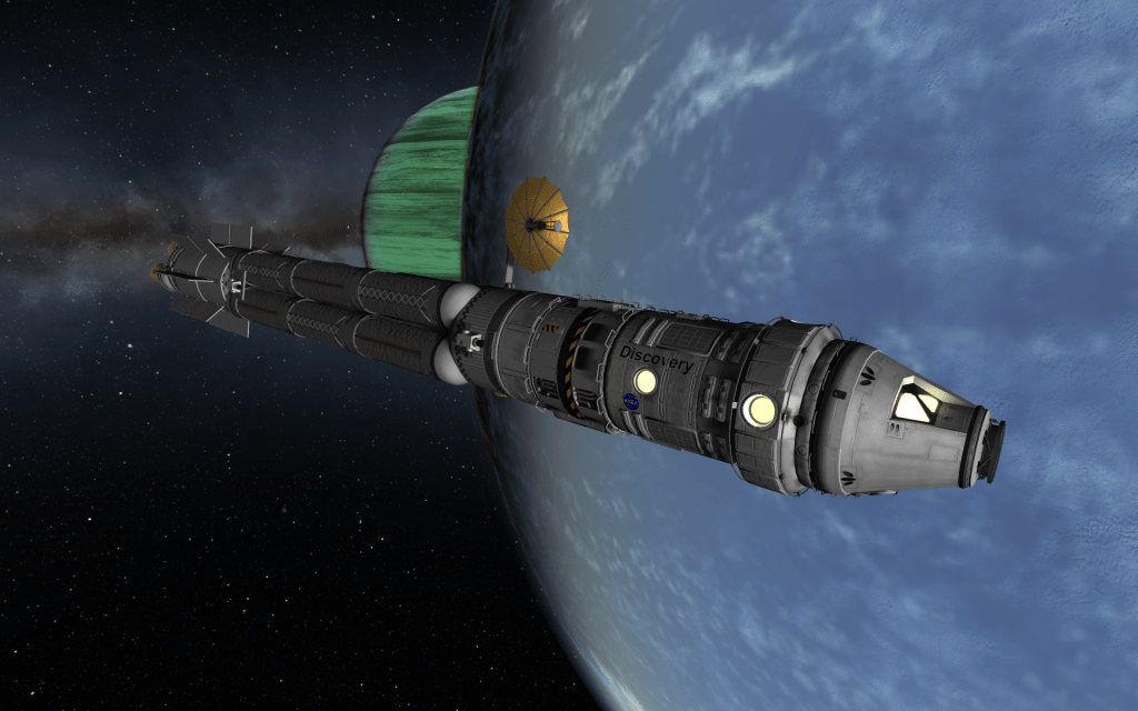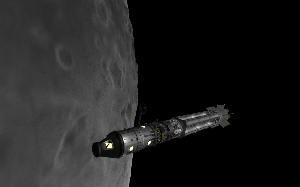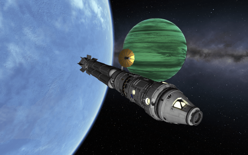 With Discovery now docked at Laythe Spaceport, the X-10 is remotely piloted to Rendezvous! With it’s transfer stage still attached the spacecraft is very unwieldy – but it’s important to use every bit of fuel – refills are hard to come by in the Jool system!