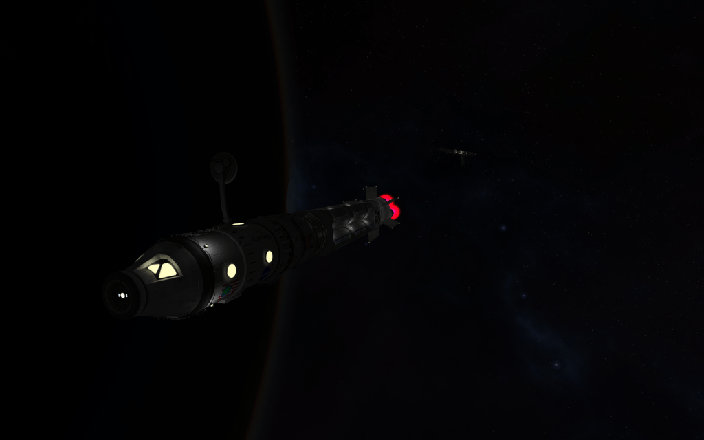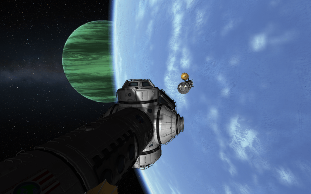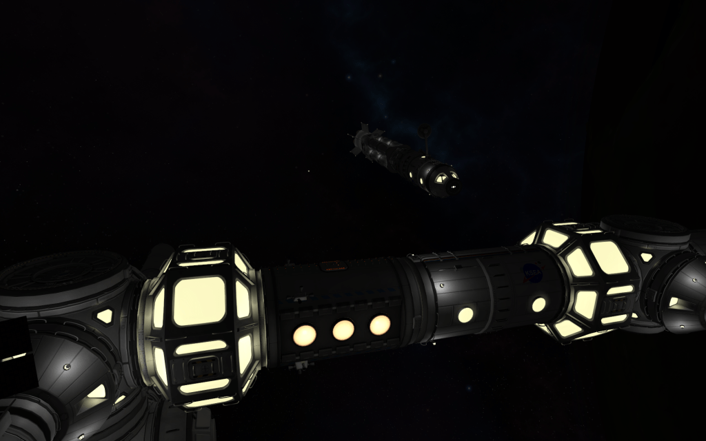 Jeb detaches the X-10 from it’s transfer stage, and pilots it to the station! The inline docking port makes the procedure a little more challenging than normal!