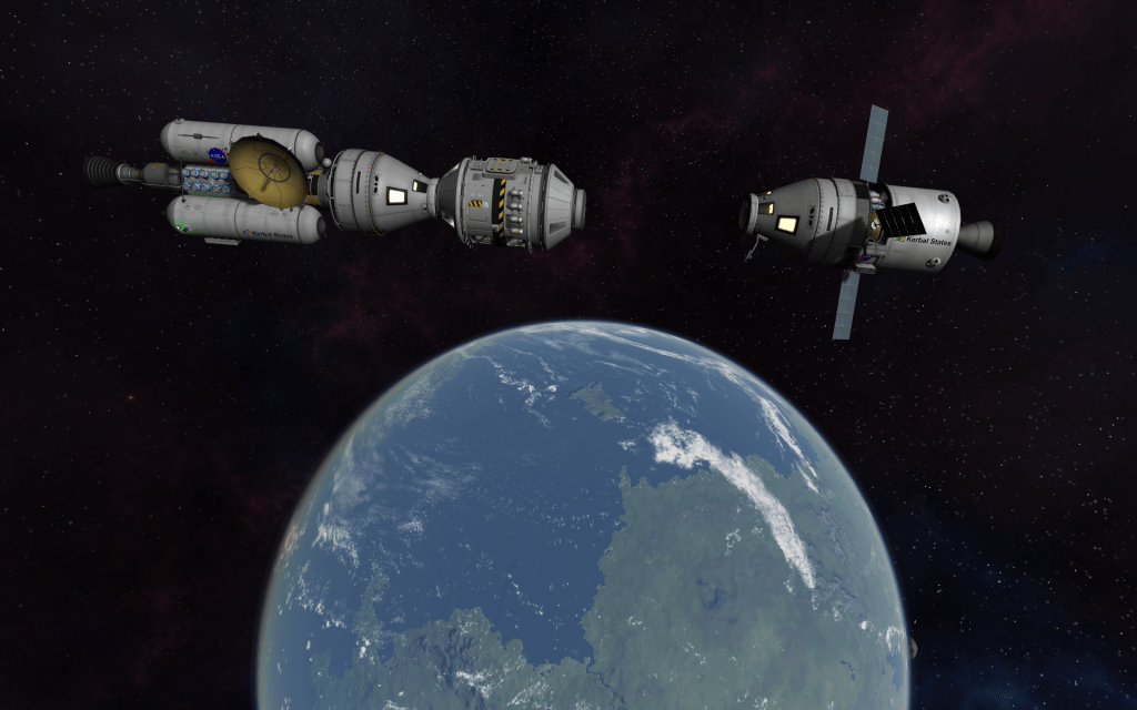 The Aurora Crew Vehicle docked at the Kerbin Spaceport undocks – this fully fueled vehicle has been at the station for quite a while, and was intended as an emergency lifeboat for the station crew in a crisis. Mission Control has decided the spacecraft will be remotely piloted and docked to the stranded Explorer 6 crew – marooned in an eccentric orbit around Kerbin!