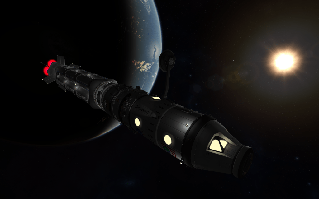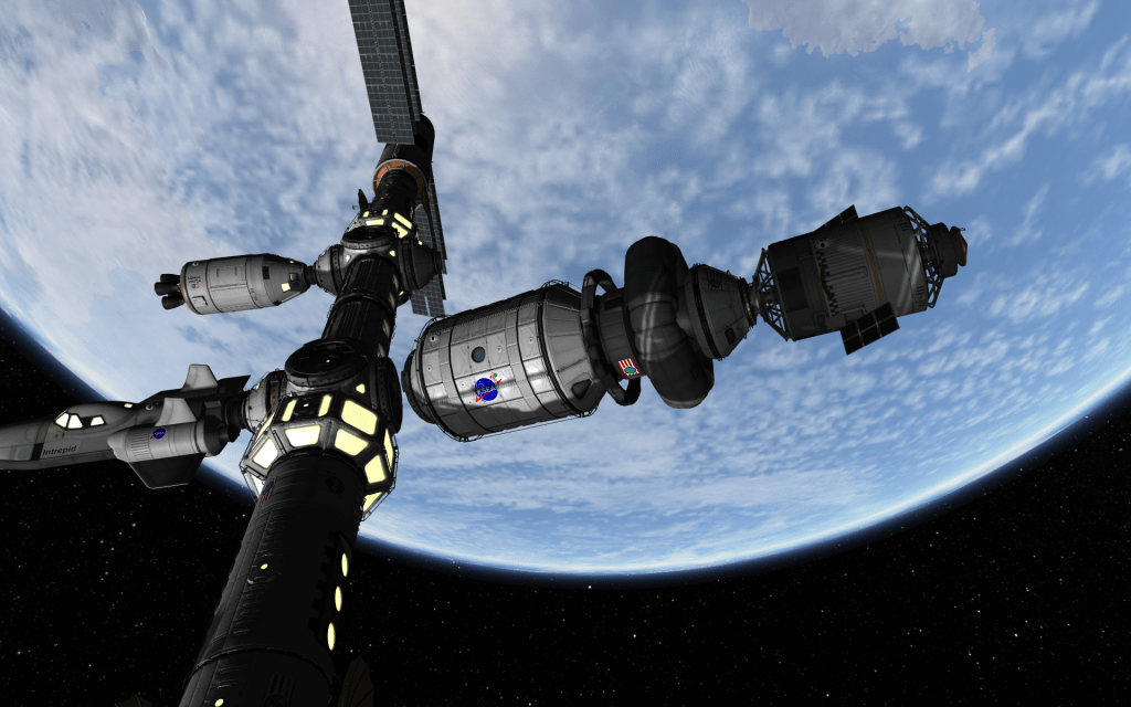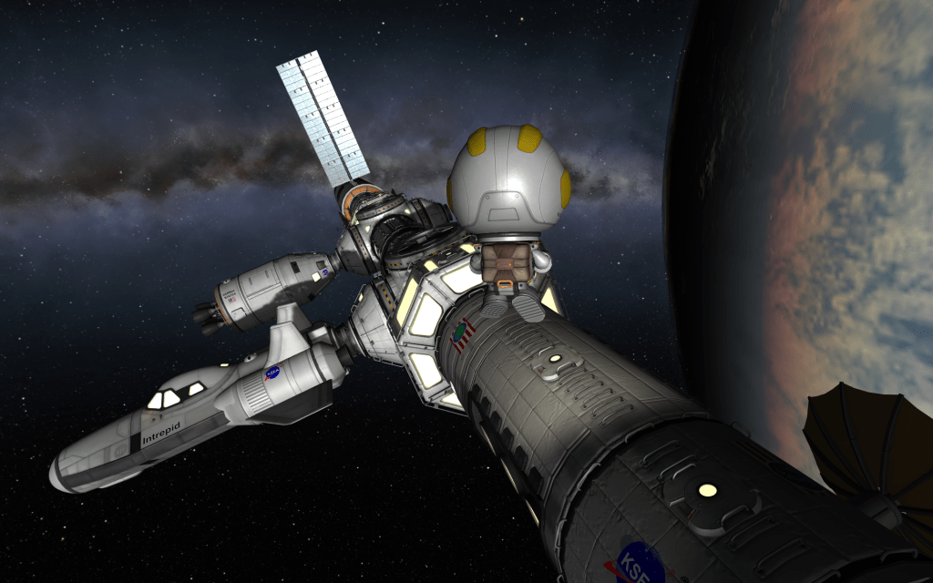 The connection is made! Intrepid arrives at Kerbin Spaceport! Jeb, Bill, and Bob gather their equipment and head out to the Spaceport! As they head to the Discovery docking hatch, Bill catches a look at the ship from the Crew Habitat Cupola!