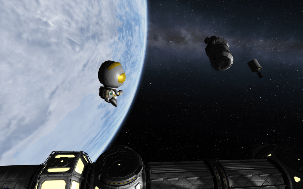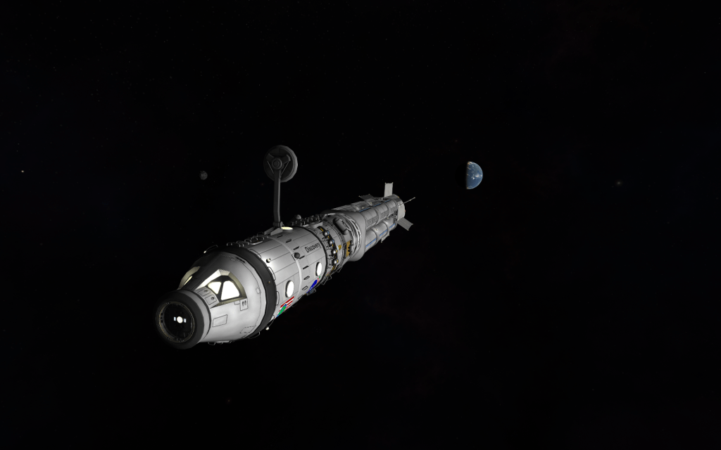 Edan undocks from the Spaceport, and uses RCS thrusters to reach a safe distance from the station! Gilian, Shepely, and Seely remain on the station, conducting the vitally important scientific research that must certainly occur there.