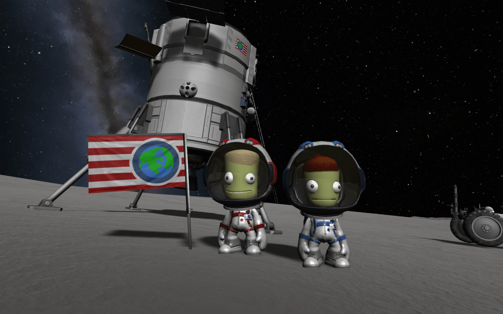 Glenica and Mitster decide to use their time waiting on Mun productively, and take the Mun Rover out for a spin! But first – Glenica plants a Kerbal Stages flag on the surface!